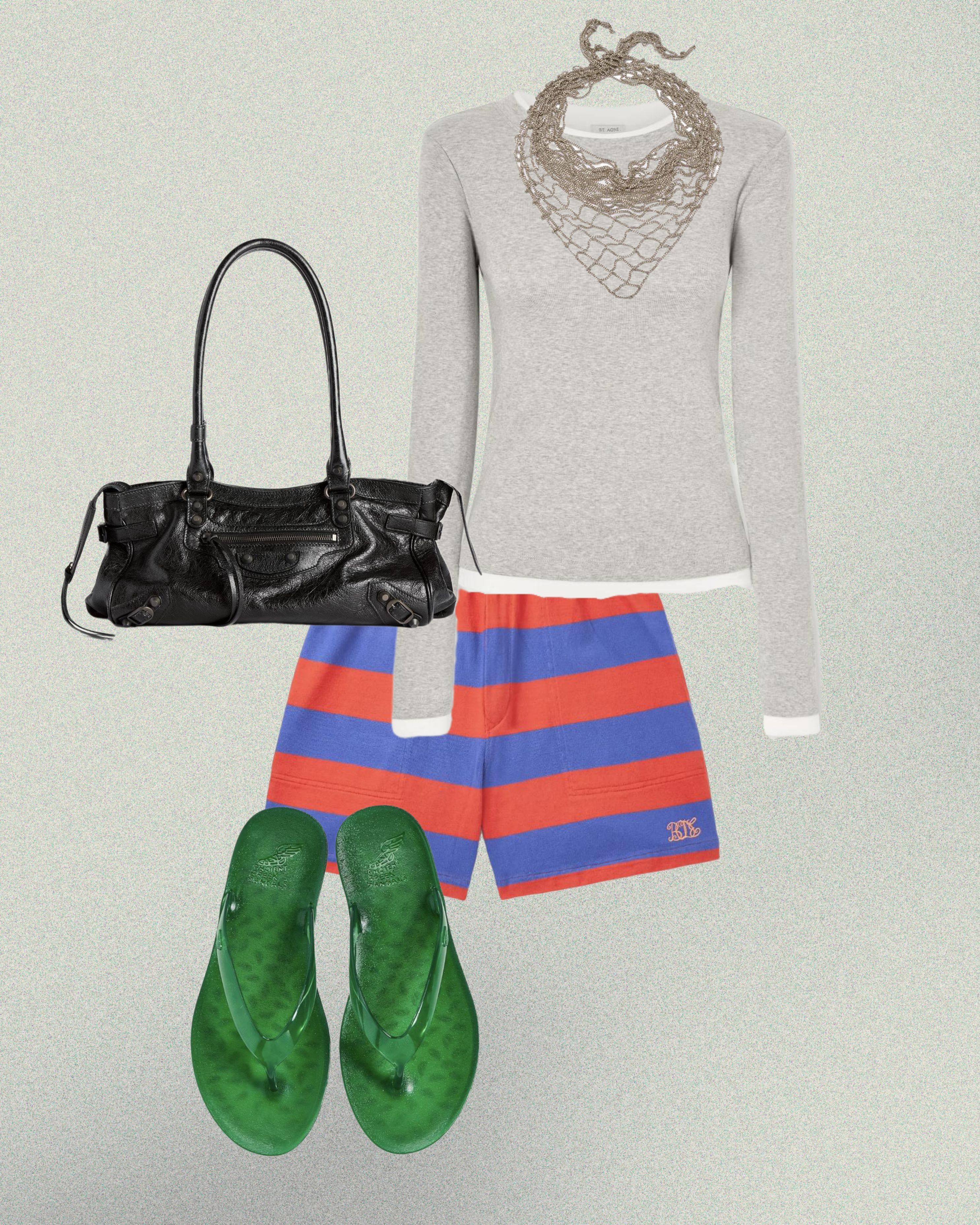 Look 2: ft. Bode Shorts and Ancient Greek flip-flops- These shorts lean a bit preppy (especially paired with the matching tee), but I love them with a basic crewneck and cool accessories.